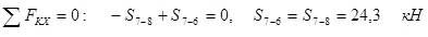 | Известными являются: внешняя сила F3=30 кН и усилие в стержне 7-8 S7-8 = 24, 3 кН. Неизвестными являются S7-6 и S7-4.