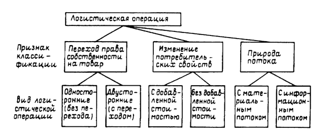 Технологические операции по производству материальных благ, т.е. операции в ходе которых происходит качественное преобразование предмета труда: рубка леса, продольная распиловка бревен, прессование стружки, изготовление деталей модели, их отделка и конечная сборка, например письменного стола. В целом логистические операции определяют как совокупность действий, направленных на преобразование материального и/или информационного потока. К логистическим операциям с материальным потоком можно отнести погрузку, транспортировку, разгрузку, комплектацию, складирование, упаковку и другие операции. Логистические операции с информационным потоком - это, как отмечалось, сбор, обработка и передача информации, соответствующей материальному потоку. Следует отметить, что издержки на выполнение логистических операций с информационными потоками составляют существенную часть логистических издержек. Выполнение логистических операций с материальным потоком, поступающим в логистическую систему или покидающим ее, отличается от выполнения этих же операций внутри логистической системы. Это объясняется имеющим место переходом права собственности на товар и переходом страховых рисков с одного юридического лица на другое. По этому признаку все логистические операции разделяют на о д н о с т о р о н н и е и д в у- с т о р о н и е. Классификация логистических операций приведена на рис. 15.
