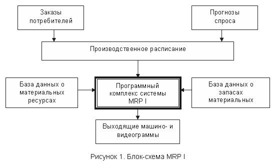 Известность получила и система «ДРП» (система планирования распределения продукции). Системы MRP оперируют материалами, компонентами, полуфабрикатами и их частями, спрос на которые зависит от спроса на специфическую готовую продукцию. Хотя сама логистическая концепция, заложенная в основу системы MRP I, сформирована достаточно давно (с середины 1950-х годов), но только с появлением быстродействующих компьютеров ее удалось реализовать на практике. В то же время революция в микропроцессорных и информационных технологиях стимулировала бурный рост различного применения систем MRP в бизнесе. Основные цели систем MRP: – удовлетворение потребности в материалах, компонентах и продукции для планирования производства и доставки потребителям; – поддержка низкого уровня запасов материальных ресурсов, незавершенного производства, готовой продукции; – планирование производственных операций, графиков доставки, закупочных операций. В процессе реализации этих целей система MRP обеспечивает поток планового количества материальных ресурсов и запасов продукции на горизонте планирования. Система MRP сначала определяет, сколько и в какие сроки необходимо произвести конечной продукции. Затем система определяет время и необходимое количество материальных ресурсов для выполнения производственного расписания. На рис. 1 представлена блок-схема системы MRP I.