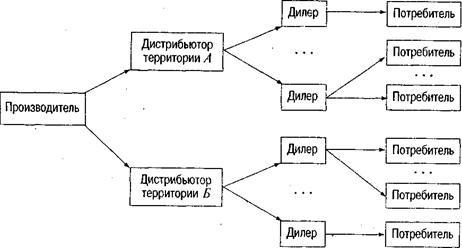 Дилеры – это оптовые (реже розничные) посредники, которые ведут операции от своего имени и за свой счет. Товар приобретается ими по договору поставки. Таким образом, дилер становится собственником продукции после полной оплаты поставки. Отношения между производителем и дилером прекращаются после выполнения всех условий по договору поставки. В логистической цепи дилеры занимают положение, наиболее близкое к конечным потребителям. Дистрибьюторы – оптовые и розничные посредники, ведущие операции от имени производителя и за свой счет. Как правило, производитель предоставляет дистрибьютору право торговать своей продукцией на определенной территории и в течение определенного срока. Таким образом, дистрибьютор не является собственником продукции. По договору им приобретается право продажи продукции. Дистрибьютор может действовать и от своего имени. В этом случае в рамках договора на предоставление права продажи заключается договор поставки. В логистической цепи дистрибьюторы обычно занимают положение между производителем и дилерами (рис. 2.6).