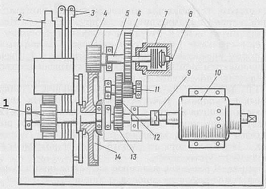 На дорогах сети получили распространение стрелочные электроприводы типов СПВ-5 (взрезной), СП-2, СП-3 и СП-6 (невзрезные). С 1981 г. начат серийный выпуск стрелочного невзрезного электропривода типа СП-6. При снятом электродвигателе электропривод может быть переведен на ручное управление рукояткой при помощи специальной оси, надеваемой на выступающий из редуктора квадрат вала – шестерни. На рис. показан схематический чертеж механической передачи электропривода типа СП-6. Шестерни 6, 11, 12 и 13 редуктора (см. рис.) находятся в закрытом корпусе, заполняемом маслом. Во фрикционной муфте 7 расположены четыре подвижных и четыре неподвижных стальных диска, сжимаемых тремя тарельчатыми пружинами. Силу нажатия пружин на диски регулируют гайкой 8. Подвижные диски соединены с зубчатым колесом 6, а неподвижные расположены на втулке, которая соединена шпонкой с валом – шестерней 4. От электродвигателя 10 через муфту 9 и шестерни 13, 12 и 11 вращение шестерни 6 передается через фрикционное устройство на вал 5 и шестерню 4. Последняя передает вращение на ведущее зубчатое колесо 14, которое свободно посажено на главный вал шиберной шестерни 1. С поворотом ведущего зубчатого колеса 14 на угол 46° (холостой ход привода) оно входит в жесткое соединение с главным валом, который выполнен как одно целое с шиберной шестерней. Дальнейший поворот ведущего зубчатого колеса 14 приводит во вращение шиберную шестерню и в поступательное движение рабочий шибер 2, вызывая перемещение и запирание остряков стрелки. Одновременно с остряками перемещаются и контрольные линейки 3, которые взаимодействуют с контактной системой автопереключателя. Для контроля нахождения стрелки в крайних положениях и плотности прилегания остряков к рамным рельсам предназначены контрольные линейки. Зазор 1—3 мм между зубом ножевого рычага автопереключателя и скосом выреза контрольной линейки прижатого остряка регулируют с помощью Т-образной регулировочной пластинки. Пластинка крепится винтом к корпусу электропривода с внутренней стороны над контрольными линейками Л1 и Л2. Зазор регулируют следующим образом. Линейку Л1 прижатого остряка втягивают внутрь электропривода до упора скоса ее выреза в зуб ножевого рычага автопереключателя. В этом положении на линейке Л1, отступив на 3 мм от заплечика пластинки, делается насечка Н1. Длина контрольной тяги в этом случае должна быть такой, чтобы при установке ее насечка Н1 на контрольной линейке совпала с гранью заплечика пластинки.