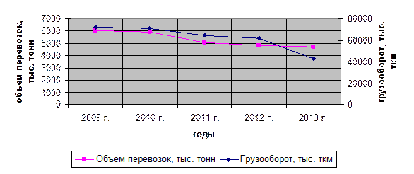 Рисунок 2.1 - Динамика объема перевозок и грузооборота в ОАО «Автосила» Примечание - Источник: собственная разработка