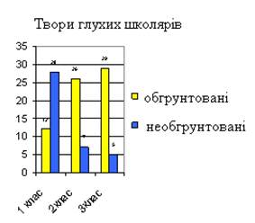 Вибір інформації та дотримання послідовності в її розміщенні - складна діяльність; для її виконання необхідно вміння складати попередній план викладу, розмістивши окремі елементи не в тому порядку, в якому вони сприймаються, а відповідно до логіки переданої ситуації. За послідовністю використовуваного матеріалу твори молодших школярів можна розділити на три групи: 1) Повне дотримання послідовності. 2) Послідовність дотримана частково. 3) Логічна послідовність відсутня. Найбільш складно глухим школярам дотримуватися послідовності у творах у тому випадку, якщо потрібно дотримуватися хронології подій. У творах про вихідні дні можна дотримуватися часової послідовності подій, їх проходження, що полегшує вибір і дотримання певного порядку розміщення інформації. У творах про літні канікули, оскільки описується тривалий період часу, виникає необхідність групувати події, виокремити і систематизувати інформацію, що підлягає опису в тому порядку, який обраний автором. Тому в творах про канікули зустрічається значно більше помилок в послідовності (93, 5%), ніж у творах про вихідні дні (57, 3%).