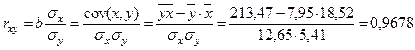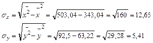Используя полученные параметры a и b получим следующее уравнение регрессии: yх = 0, 29 + 0, 41· x Коэффициент регрессии b показывает, что при увеличении рентабельности продаж на 1%, рентабельность собственного капитала увеличится в среднем на 0, 41%. Тесноту линейной связи оценим с помощью коэффициента корреляции. Для этого сначала найдем среднеквадратические отклонения х и у по формулам: