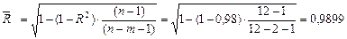 Показатель корреляции показывает на наличие очень сильной связи между факторами и результатом. Значение коэффициентов парной корреляции указывают на сильную связь рентабельности собственного капитала с рентабельностью продаж – х1, и на умеренную связь с коэффициентом оборачиваемости активов – х2. Но в то же время rx1x2 =0, 27 указывает на отсутствие коллинеарности между факторами. Скорректированный коэффициент корреляции рассчитаем по формуле: