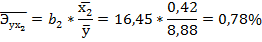 При закреплении фактора x1 на постоянном уровне корреляция у и х2 оказывается ниже (0, 2 против 0, 44). Показатели частной корреляции не сильно отличаются от обычных парных коэффициентов корреляции – это связано с тем, что связь между факторами слабая неколлинеарная, поэтому в чистом виде степень тесноты связи у совпадает со значением коэффициентов парной корреляции. Для характеристики относительной силы влияния х1 и х2 на у рассчитаем частные средние коэффициенты эластичности (26):