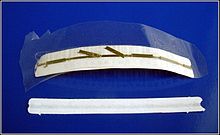 Рисунок 1. Электромагнитная метка Этот вид меток особо любят клеить на книги — они тонкие, также они удобны в библиотеках: деактивируется при выдаче, реактивируется после возвращения. 1.7.2 Акустомагнитные системы Устройство этих меток сильно похоже на магнитные, но отличен принцип детектирования метки. Смысл в том что свободное положение магнитострикционной полоски в объемной метке позволяет ей совершать свободные механические колебания под действием магнитного поля. При этом механическая добротность системы на частоте накачки выбирается максимально возможной, и полоска продолжает колебаться некоторое время после снятия накачки. При этом согласно тому же магнитострикционному эффекту теперь уже полоска создает переменное магнитное поле, которое и регистрируется системой. Магнитная полоска (рисунок 2) участвует в механическом резонансе, поэтому эти метки активируются намагничиванием и деактивируются размагничиванием. Поскольку намагничивание должно быть определенным по величине и направлению, то повторная активация таких меток не предусматривается.