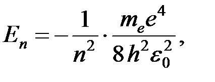 При переходе атома из состояния большей энергии в состояние меньшей энергии, то есть при переходе электрона на менее удаленную от ядра орбиту, происходит излучение фотона, а при поглощении фотона происходит переход атома из состояния меньшей энергии в состояние большей энергии, что соответствует переходу электрона на более удаленную орбиту. Дискретность набора значений энергии стационарных состояний En и Еm предопределяет дискретность набора возможных частот ν квантовых переходов между этими состояниями, что обусловливает линейчатость спектра атома. По теории Бора полная энергия электрона на n -ой орбите атома водорода: