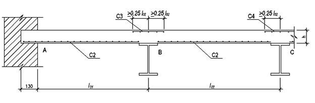 где h – толщина плиты. Толщина плиты по условиям экономичного армирования может быть принята h = 60…90 мм, кратно 10 мм. Меньшее значение толщины относится к меньшим пролетам и нагрузкам. Расчетная величина средних пролетов принимается равной расстоянию между балками в осях, то есть l2 = l02 4. Определение расчетных нагрузок. Постоянная нагрузка определяется как сумма собственного веса плиты (gnл) и веса конструкции пола и перегородок (gn). g = gnл + gn кН/м2, где gnл = γ fg · h · 10 · ρ, ρ – плотность бетона, тяжелый бетон имеет плотность ρ = 2, 5 т/м3, γ fg – 1, 1; gn = γ fg · gп Временная нагрузка ν = γ fv · ν n γ fv = 1, 2 Погонная расчетная нагрузка для полосы плиты шириной 1 м равна g = γ n (g + ν), кН/м. 5. Статический расчет. Определение значений изгибающих моментов Мmax, в расчетных сечениях плиты при раздельном армировании (см. ниже п. 7): - в крайних пролетах - - на вторых от края опорах В - - в средних пролетах - - на средней опоре С -