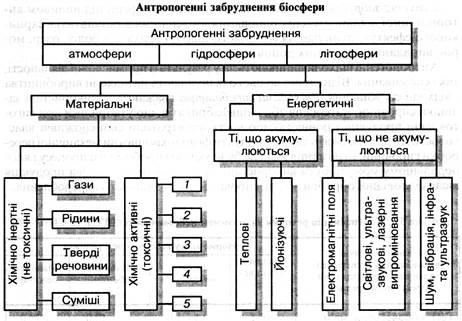 До матеріальних належать викиди в атмосферу (газоподібні, рідкі, тверді та змішані), стічні води (умовно чисті й брудні) та тверді відходи (нетоксичні й токсичні). До енергетичних віднесені теплові викиди, шум, вібрація, ультразвук, електромагнітні поля, світлове, лазерне, інфрачервоне, ультрафіолетове, йонізуюче та електронне випромінювання. За ознакою взаємодії з навколишнім середовищем забруднення поділяють на стійкі, які не руйнуються впродовж тривалого часу (наприклад, пластмаси), і нестійкі, які швидко руйнуються під дією природних фізико-хімічних або біохімічних процесів. Під навмисними забрудненнями розуміють цілеспрямоване знищення лісів, використання родючих земель і пасовиськ під забудову, утворення внаслідок техногенної діяльності людей кар'єрів, шламонакопичувачів, териконів, мулових майданчиків, неправильне використання поверхневих і підземних вод, мінеральних та інших природних ресурсів. Супутнє забруднення – це поступові зміни біосфери під впливом антропогенної діяльності (спустелювання, потепління в результаті «парникового ефекту», руйнування озонового шару, висихання боліт, озер, морів, випадання кислотних дощів тощо). Антропогенні відходи виникають як у результаті промислової діяльності, так і споживання. Відповідно до цього їх поділяють на відходи виробництва і відходи споживання. Відходами виробництва вважають невикористані залишки сировини, матеріалів або напівфабрикатів, що утворилися при виготовленні продукції і повністю або частково втратили свої споживчі властивості. До них належать також продукти фізико-хімічної чи механічної переробки сировини, отримання яких не було метою виробничого процесу і які в подальшому можуть бути використані в господарстві як готова продукція після відповідної обробки або як сировина для подальшого перероблення. Таблиця 5.1. Класифікація речовин за ступенем небезпечності (ДГСТ 12.1.007-76)