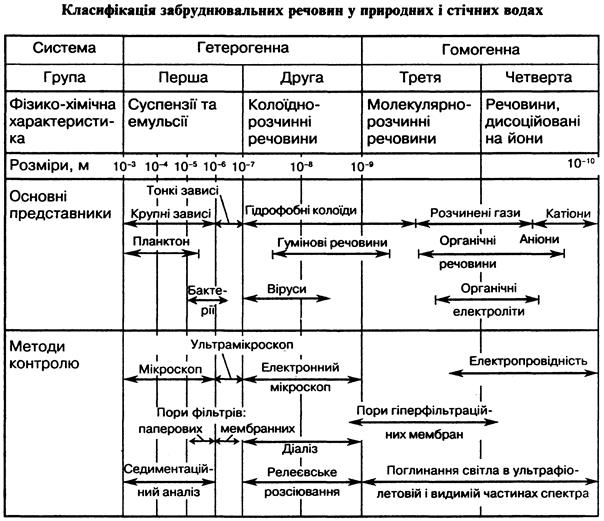 Згідно з класифікацією, запропонованою Л. А. Кульським, забруднювальні речовини за їх фазово-дисперсним станом і відношенням до дисперсійного середовища поділяють на чотири групи. Домішки перших двох груп (крім високомолекулярних сполук) утворюють термодинамічно нестійкі гетерогенні системи, а двох інших – термодинамічно рівноважні оборотні гомогенні системи (див. схему на с. 98). До першої групи належать не розчинні у воді зависі, а також бактерії та планктон. Вони кінетично нестійкі і підтримуються у завислому стані динамічними силами водяного потоку. В стані спокою зависі осідають. Розмір їх часточок становить 10-3-10-7 м. Друга група домішок поєднує гідрофільні й гідрофобні мінеральні та органо-мінеральні колоїдні часточки ґрунтів, недисоційовані і нерозчинні форми високомолекулярних гумусових речовин, детергенти та інші речовини. До цієї групи належать також віруси і мікроорганізми, які за своїми розмірами близькі до колоїдних часточок. Розміри дисперсних часточок знаходяться в межах 10-7-10-9 м. Кінетична стійкість гідрофобних домішок характеризується співвідношенням сил гравітаційного поля і броунівського руху. Агрегативна стійкість їх зумовлена електростатичним станом міжфазної поверхні і утворенням на поверхні частинок стабілізувальних шарів. Третя група забруднювальних домішок включає молекулярно-розчинні сполуки розміром менш ніж 10-9 м. До неї відносять розчинені гази, органічні речовини біологічного походження та інші домішки, що можуть міститися в складі промислових і господарсько-побутових стоків. У водному середовищі можливий перебіг двох процесів: сполучення різнорідних молекул (гідратація) і сполучення однорідних молекул (асоціація). Молекулярно-розчинні речовини здатні за рахунок водневих зв'язків утворювати з водою неміцні сполуки, що існують лише в розчині. Велике значення ці зв'язки мають також при асоціації молекул розчиненої речовини. Необхідною умовою їх виникнення є достатня полярність валентних зв'язків гідрогену у вихідних речовинах.