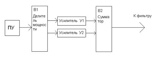 Эквивалентная схема сумматора представляет собой источник напряжения с внутренним сопротивлением, равным сопротивлению тракта, двух параллельно соединенных микрополосковых линий, нагруженных на сопротивления нагрузки, равные также сопротивлению тракта. Для развязки в линии включено балластное сопротивление, равное удвоенному сопротивлению нагрузки. Схема имеет вид: