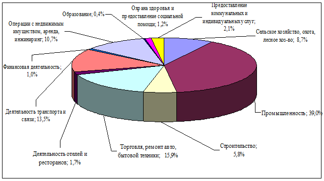 Процесс развития предпринимательской деятельности Украины характеризуется неравномерным распределением субъектов предпринимательства по видам экономической деятельности. На основе проведенных расчетов можно сделать вывод, что в структуре численности занятых в предпринимательстве в 2012 г. преобладают занятые в промышленной сфере (39, 0%), торговлей, в основном, оптовой (15, 9%), осуществляющие деятельность в сфере транспорта и связи (13, 5%), операции с недвижимостью, аренду, инжиниринг (10, 7%). Следует отметить, что в последние годы наряду с промышленными сферами развиваются и сфера услуг, где осуществляется быстрый оборот средств, не требуется крупных материальных затрат и инвестиций (рис. 2. 3).