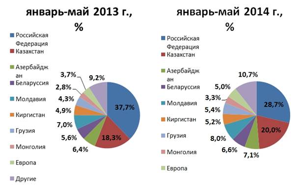 *Источник: Государственная служба статистики Украины У структурі експорту українського хліба та хлібобулочних виробів Російська Федерація залишається основним споживачем. Однак слід відзначити падіння обсягу експорту хліба і хлібобулочних виробів в РФ, якщо за 5 міс. 2013 р. частка українського експорту в РФ склала 37, 7%, то за 5 міс. 2014 р. вона скоротилася до 28, 7%, що спричинене напруженою економіко-політичною ситуацією між країнами і посиленням митного контролю. На тлі зниження частки продажу хліба і хлібобулочних виробів в РФ, частка експорту в країни Європи зросла з 3, 7% до 5%. За підсумками періоду січень-травень 2014 р. іншими великими споживачами українського хліба та хлібобулочних виробів є: Казахстан – 20%, Молдова – 8%, Азербайджан – 7, 1%, Білорусія – 6, 6%. Таким чином, поставки хліба та хлібобулочних виробів з України досить диверсифіковані (рис. 2).
