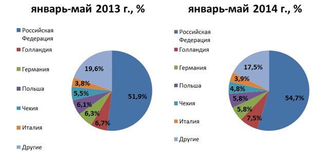 Рисунок 1.2 – Структура експорту хліба і хлібобулочних виробів за підсумками 5 міс. 2013 року–5 міс. 2014 року з України в натуральному вираженні, % Найбільш популярною імпортною продукцією на ринку хліба та хлібобулочних виробів України є продукція РФ, яка за підсумками 5 міс. 2014 р. становить 54, 7% від загального імпорту в Україну. Варто зазначити, що значна частка імпорту припадає на європейські країни: Голландію – 7, 5%, Німеччини – 5, 8%, Польщу – 5, 8%, Чехії – 4, 8%, Італії – 3, 9% (рис. 3).