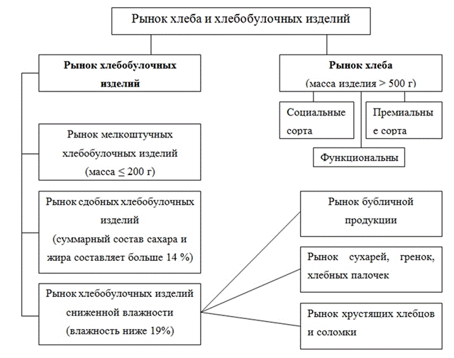 На думку експертів, сьогодні розвиток ринку хлібобулочних виробів відбувається в основному за рахунок нетрадиційних сортів, зростає попит на нові сорти хліба з більш складною рецептурою і здобу, в той час як споживання «соціального» хліба досить стабільна протягом вже кількох років - його частка становить близько 50%. Споживачі, у тому числі і з достатком, перебувають у полоні «національного» стереотипу і не готові до того, що хліб може бути дорогим продуктом. Цей стереотип дещо затримує розвиток ринку в цілому, гальмуючи зростання сегменту більш дорогого «брендового» хліба. Основними споживачами хлібобулочної продукції є всі категорії населення України в цілому. Отже, варто додати, що попит на цей вид продукції є нееластичним. Хліб — продукт, випечений з тіста, яке приготовлене згідно з відповідними рецептами і технологічними режимами. Маса окремого виробу перевищує 500 г. Залежно від виду борошна, яке використовується для приготування тіста, хліб поділяється на житній, пшеничний, житньо-пшеничний і пшенично-житній; від способу випікання — формовий і подовий; від рецептури — простий і поліпшений. Хліб з житнього борошна. До простих видів хліба з житнього борошна належать: хліб з оббивного, з обдирного та із сіяного борошна. Поверхня хліба з сіяного борошна, як правило, гладенька, з оббивного — шорстка, з наколеннями або без них; колір від світло-коричневого (сіяного) до темно-коричневого (оббивного). Вологість хліба коливається в межах 43-53 %, пористість — від 45 до 60 %, кислотність — від 7 до 13°. Хліб з нижчих сортів борошна характеризується вищою вологістю і кислотністю і меншою пористістю. Дещо меншу вологість і пористість мають подові види хліба. В рецептуру поліпшених видів житнього хліба входить солод, патока, молочна сироватка, прянощі. Найбільш поширеними різновидами поліпшеного житнього хліба є такі: житній, житній заварний обдирний і оббивний, Московський, Шахтарський. Хліб житній виготовляють з обдирного борошна. В рецептуру входять патока та молочна суха сироватка. Випікають його формовим і подовим способами. Хліб житній заварний готують з обдирного або оббивного борошна і солоду у співвідношенні 95 до 5. В його рецептуру входить також кмин. Хліб випікають формовим способом. Вироби мають темний колір м'якушки і скоринки. Це пояснюється тим, що приблизно 10 % всієї кількості борошна заварюють водою, температура якої досягає 95-97 °С. Поверхня хліба з наколеннями або без них, обсипана кмином або анісом. Хліб має приємний запах і солодкуватий смак. Для приготування Московського хліба використовують житнє оббивне борошно і житній солод у співвідношенні 93 до 7, патоку, кмин. Тісто для цього хліба готують заварним способом. Спосіб випікання хліба — формовий. Вироби мають темний колір. Особливо темною є скоринка. Заварний спосіб приготування тіста і прянощі надають хлібу характерного запаху, солодкуватого смаку. Хліб Шахтарський належить до українського національного хліба. Його виготовляють з борошна житнього обдирного. В рецептуру входять патока, цукор, коріандр, гвоздика. Спосіб випікання — подовий. Вологість поліпшених назв хліба від 43 до 53 %, кислотність — 7-13°, пористість 50-58 %. Хліб з житньо-пшеничного борошна. У ньому переважає житнє борошно. За рецептурою поділяється на простий і покращений. Найбільш поширеним простим
