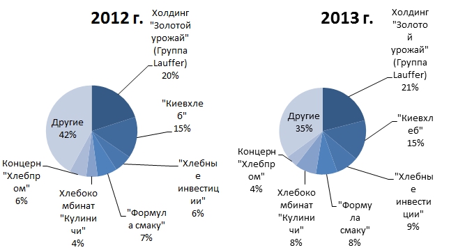 Рисунок 1.7 – Основні виробники хліба і хлібобулочних виробів в Україні за 2012-2013 рр. Компанія InVenture Investment Group провела дослідження по рынкухлеба та хлібобулочних виробів і надає детальну інформацію по ключовим гравцям ринку. Таблиця 1.5 – Основні виробники ринку хліба та хлібобулочних виробів