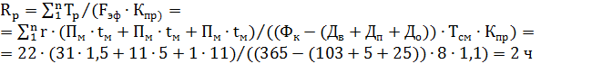 где Тр – трудоемкость ремонтных операций по объекту; Fэф – эффективный фонд рабочего времени одного человека, ч; Кпр – коэффициент перевыполнения норм выработки, принимают равным 1, 1 [16]. Пм, Пс, Пк – среднее количество, соответственно, малых, средних и капитальных ремонтов в год; tм, tс, tк – нормы времени на проведение малого, среднего и капитального ремонта на одну ремонтную единицу, ч, по ППР, принимаем равным: малого-1, 5, сраднего-5 и капитального-11 [16]; ∑ r – суммарная ремонтная сложность. Fэф - эффективный фонд рабочего времени одного человека, часы; Фк – календарный фонд, принимают равным 365 дней; Дв – количество выходных, дни; Дп – количество праздничных дней, дни; До – количество дней отпуска, дни; Тсм – продолжительность рабочей смены, ч Количество дежурного персонала, Rдеж, человек, вычисляют по формуле [16]: