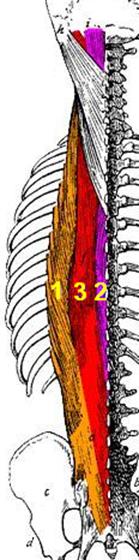 Начало: Подвздошно-реберная мышца от заднего отдела латерального крестцового гребня; вблизи углов нижних пяти-шести ребер; вблизи углов нижних пяти-шести ребер. Остистая мышца начинается от остистых отростков двух-трех верхних поясничных и двух-трех нижних грудных позвонков; от остистых отростков верхних грудных и нижних шейных позвонков. Длиннейшая мышца начинается от задней поверхности крестца, поперечных отростков поясничных и нижних шести-семи грудных позвонков; от поперечных отростков четырех-пяти верхних грудных и нижних шейных позвонков. Прикрепление: Подвздошно-реберная мышца прикрепляется к углам всех ребер и поперечным отросткам нижних шейных позвонков. Остистая мышца прикрепляется на остистых отростках 8-2 грудных позвонков; на остистых отростках верхних шейных позвонков; вблизи наружного затылочного выступа. Длиннейшая мышца прикрепляется к углам десяти нижних ребер и к задним отделам поперечных отростков всех грудных позвонков; к поперечным отросткам позвонков от осевого до 5 шейного; к заднему краю сосцевидного отростка. Функция: при двустороннем сокращении является мощным разгибателем позвоночного столба, удерживает туловище в вертикальном положении. При одностороннем сокращении наклоняет позвоночный столб в соответствующую сторону. Верхние пучки мышцы тянут голову в свою сторону. Частью своих пучков она опускает ребра.