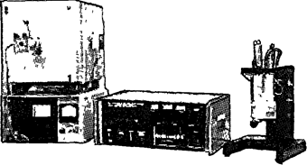 Рис.7. Экспресс-анализатор на серу АС-7932. Диапазон измеряемых массовых долей серы от 0, 001 до 0, 2% S. Сходимость показаний (среднее квадратичное отклонение случайной составляющей основной относительной погрешности) не более: 1. 2%- для массовой доли 0, 2% S; 2. 2, 7%-для массовой доли 0, 1% S; 3. 7, 4%-для массовой доли 0, 01% S; 4. 20%-для массовой доли 0, 001% S. Масса навески до 2 г. Ввод данных о массе навески ручной или автоматический (при наличии коллектора массы). Продолжительность анализа легко сжигаемых образцов стали 1-2 мин. Установка времени таймера для автоматической остановки до 9, 9 мин. Расход кислорода 2, 7-3, 7 л/мин. Питание от сети переменного однофазного тока: напряжение 220 В, частота 50 или 60 Гц. Потребляемая мощность 150 В-А (без устройства сжигания). Мощность, потребляемая устройством сжигания, 3 кВ-А. Габаритные размеры: измерительного блока 500х220х415 мм; датчика 250х500х300 мм; блока газоподготовки 150х200х450 мм; устройства сжигания 420х450х630 мм. Масса соответственно: 20; 5; 6; 60кг. 2.1. Принцип действия анализатора. В анализаторе применён метод автоматического кулонометрического титрования по величине рН. Пробу металла 1 виде стружки или порошка сжигают с добавлением плавня (пятиокиси ванадия) в фарфоровой лодочке 2 в рабочей зоне печи 4 устройства сжигания при температуре 1350°С в потоке очищенного от влаги кислорода. Образовавшиеся при сжигании серы, содержащейся в пробе, газообразные окислы, отводятся из печи через газоотборник. Благодаря наличию водоохлаждённого газоотборника происходит стабилизация соотношения SO2 и SO3 в газовой смеси, в результате чего сера окисляется преимущественно до сернистого газа (SO2). После очистки от пылевидных окислов в фильтре предварительной очистки 9 газовая смесь поступает через газоподводящую трубку 10 в поглотительный раствор 11, залитый в сосуд 12. при барботаже газовой смеси в поглотительном растворе происходит поглощение сернистого газа этим раствором, сопровождающееся закислением (уменьшением величины рН) последнего. Происходящее при этом изменение э.д.с. индикаторной электродной системы, состоящей из измерительного 14 и вспомогательного 15 электродов, преобразуется рН-метром 13 в сигнал, управляющий импульсным преобразователем, который включает стабилизированный источник тока 16. При протекании генераторного тока на катоде происходит разряд ионов водорода, концентрация этих ионов в растворе понижается (рН раствора повышается). Протекание генераторного тока происходит до того момента, когда рН поглотительного раствора станет равной исходной (рН»3, 3). Количество электричества, затраченное на титрование всего образовавшегося при сжигании сернистого газа, является, таким образом, мерой массовой доли серы в образце. Количество электричества измеряется интегратором тока 17. величина, пропорциональная этому количеству, индицируется на цифровом табло 18 измерительного блока. Коэффициент пересчёта в зависимости от массы навески, установленной вручную или автоматически от корректора массы, вводится с помощью делителя частоты, входящего в состав измерительного блока. При поглощении сернистого газа поглотительным раствором, в состав которого входят перекись водорода и хлористый барий, происходят следующие реакции: SO2+H2O®H2SO3 H2SO3+H2O2®H2SO4+H2O H2SO4+BaCl2®BaSO4+2HCl Образовавшаяся молекула HCl диссоциирует на ионы: 2HCl®2H++2Cl- При этом на катоде