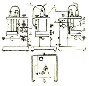Рис.9. Датчик. 1-кнопка подкисления; 2-переключатель " холостого счёта"; 3-тумблер включения тока титрования; 4-электродная система; 5-винт; 6-анодный отсек; 7-прижимной контакт анода; 8-катодный отсек; 9-штеккер катода; 10-промежуточный сосуд; 11-прижимной рычаг.