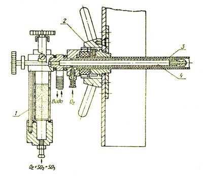 Рис.11. Газоотборник. 1-фильтр; 2-зажимное устройство; 3-труба сжигания; 4-водоохлаждаемая фурма.