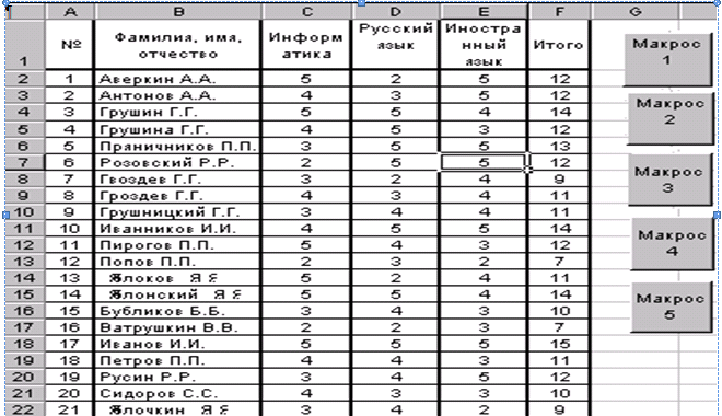 Для пояснения работы с расширенным фильтром необходимо вначале набрать таблицу результатов вступительных экзаменов небольшого размера. Абитуриенты сдают вступительные экзамены по информатике, русскому, и иностранному языку. Результаты каждого экзамена заносятся в таблицу. Образец таблицы приведён на рис. 5.3.1. Для работы с расширенным фильтром необходимо создать вспомогательную таблицу, у которой заголовки точно соответствуют заголовкам исходной таблицы. Вспомогательная таблица создается путем копирования заголовков исходной таблицы. Т.к. список абитуриентов может пополняться, то лучше вспомогательную таблицу создавать выше основной таблицы, чтобы эта вспомогательная таблица была всегда видна (рис.5.3.2.). Во вспомогательную таблицу вводятся условия фильтрации. При вводе условий по горизонтали в строку между столбцами (по введенным условиям) выполняется логическая операция «И». При вводе условий в разные строки между столбцами (по введенным условиям) выполняется логическая операция «ИЛИ». Затем курсор вводится в поле основной таблицы и используется вкладка Данные – Дополнительно. Появляется диалоговое окно Расширенный фильтр. Необходимо указать в этом окне, где будет осуществлена фильтрация (фильтровать список на месте). Уточнить при необходимости исходный диапазон и указать диапазон условий. Далее кн. ОК. В данном задании рекомендуется создать с помощью макрорекордера макросы с выводом управления на кнопки, размещенные на листе, для следующих операций: · Сортировать таблицу по столбцу «Фамилия, имя, отчество». · Сортировать таблицу по столбцу «Итого» (первичный ключ сортировки), а затем по столбцу «Фамилия, имя, отчество» (вторичный ключ сортировки). · Отобразить строки таблицы с абитуриентами, которые не имеют ни одной двойки. · · Отобразить строки таблицы с абитуриентами, которые не имеют двоек и получили хотя бы одну пятёрку.