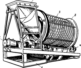 Дуговые грохоты широко используют для мокрого грохочения тонких продуктов. Рабочая поверхность - изогнутая в виде дуги плоскость, которая набрана из поперечной колосниковой решетки. На верхний край дуги подается исходный материал в виде пульпы. Мелкие зерна вместе с водой разгружаются через сито в разгрузочную коробку, а крупные - в конце дугового сита. Поскольку пульпа движется по дуге, возникающая центробежная сила повышает эффективность грохочения, она может достигать 90 %. Дуговые грохоты применяют при ширине щелей от 0, 25 до 3 мм. Барабанные грохоты в зависимости от формы барабана могут быть цилиндрическими или коническими. Боковая поверхность барабана, образованная перфорированными стальными листами или сеткой, служит просеивающей поверхностью грохота. Ось цилиндрического барабана наклонена к горизонту под углом 4-7°, а ось конического барабана горизонтальна. Исходный материал загружают внутрь барабана на верхнем конце, и вследствие вращения и наклона он продвигается вдоль оси барабана. Мелкий материал проваливается через отверстия, крупный – удаляется из барабана на нижнем конце (рис.I.3). Диаметр барабана колеблется от 500 до 3000 мм; длина – от 2000 до 9000 мм.