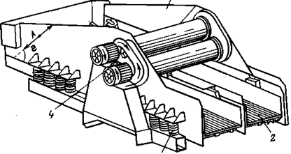Самобалансные грохоты (рис.I.4) имеют приводной механизм в виде двухвального вибровозбудителя. Прямолинейные гармонические колебания короба грохота генерируются силой инерции двух противоположно вращающихся дебалансовых грузов. Короб с ситом, закрепленный на вертикальных упругих опорах, под действием вибровозбудителя совершает прямолинейные колебания по стрелке А под углом e к плоскости сита. Ко второй группе относятся, например, инерционные грохоты, которые изготавливаются в подвесном или в опорном исполнении. Предпочтение отдается опорным грохотам как более надежным в работе. Вибрационные грохоты характеризуются высокой производительностью и значительной эффективностью (75-85 %) грохочения, поэтому являются самыми распространенными