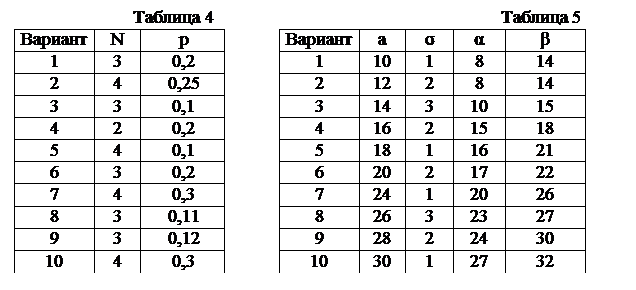 1.3. В городе имеются N оптовых баз (табл. 4). Вероятность того, что товар требуемого сорта отсутствует на этих базах, одинакова и равна p. Составить закон распределения числа баз, на которых искомый товар отсутствует в данный момент. Построить многоугольник распределения. Найти дисперсию и среднеквадратичное отклонение числа баз, на которых искомый товар отсутствует в данный момент.