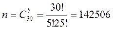 Общее число возможных элементарных исходов события n равно числу способов, которыми можно взять пяти изделий из тридцати, т.е. число сочетаний из тридцати элементов по пять.