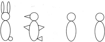 6. Продолжи ряд. Предложите детям нарисовать главных героев сказки «Заяц-хваста». Для этого выдайте им листы с индивидуальным графическим заданием «Продолжи ряд» (рис. 32, с. 71). Пусть дети продолжат ряд рисунков, изобразив еще одну ворону и зайца. Предложите малышам дорисовать картинки так, чтобы изображения зайца и вороны чередовались в том же порядке. Обратите внимание детей на то, что фигурки обоих персонажей в своей основе имеют одинаковые геометрические фигуры и отличаются друг от друга лишь дополнительными деталями, такими как уши, хвост, крылья и клюв. Предложите детям самим назвать и показать на рисунке соответствующие части тела у животных и уточните названия геометрических фигур, с помощью которых они изображены (туловище — овал, голова — круг, хвостик у зайца — маленький кружок, хвост у вороны — треугольник, заячьи уши — овалы, клюв и крылья у вороны — изображены с помощью треугольников). Предложите детям сравнить, чем отличается тело птицы (вороны) от тела зверька (зайца). 7. Подведение итогов занятия. Дайте положительную оценку работы детей. ЗАНЯТИЕ 3 Тема занятия: показываем сказку «Заяц-хваста».