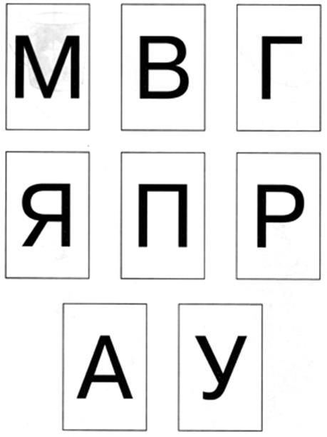 Тема занятия: читаем и показываем сказку «Гуси-лебеди». Предварительная работа: взрослый повторяет с детьми звуки [м], [в], [п] и [р]; обучает малышей четкому произнесению согласного звука [г] и звуков [й'а] (соответствующих букве Я); знакомит детей с буквами Г и Я; повторяются уже знакомые детям гласные буквы А, У, И, О и согласные буквы М, В, П и Р; взрослый учит детей выделять начальный согласный звук в словах «мыло», «мука», «вата», «ваза»; «парк», «повар», «рак», «роза», «руки»; взрослый вместе с детьми изготавливает из плотной бумаги карточки с буквами А, У, Я, М, В, Г, П и Р, необходимые для проведения занятия (образец дан на рис. 53, с. 107). Цели занятия