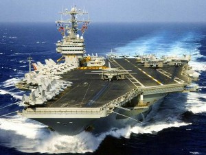 Посадка самолета на авианосец Самые большие боевые корабли на самом большом флоте в мире – американский авианосцы, это гордость ВМФ США. Авианосец USS Nimitz, базирующийся у берегов Южной Калифорнии – совершенная боевая машина водоизмещением 85 тысяч тонн. Авианосец – настоящий плавучий город, на нем живет около 6 тысяч человек, однако в этом городе – самый удивительный аэропорт в мире, нашпигованный самым современным оборудованием и разведывательной воздушной техникой – вертолетами, противолодочными самолетами, а также истребителями для воздушного боя – F18 Hornet.