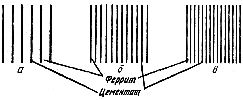 Рис. 8.6. Схема феррито-цементитных структур: При температуре 600–650 °С образуется сорбит, а при 550–600 °С — троостит. Перлит, сорбит, троостит являются структурами одной природы — механической смесью феррита и цементита и отличаются друг от друга лишь степенью дисперсности. С увеличением степени дисперсности пластин цементита растут твердость и прочность стали. Наибольшую пластичность имеют стали с сорбитной структурой. Троостит, образующийся при более низкой температуре превращения, характеризуется меньшей пластичностью (меньшими d и y). Перлит, сорбит и троостит называют перлитными структурами. Перлитные структуры в зависимости от формы цементита могут быть пластинчатыми или зернистыми. Пластинчатые структуры образуются при превращении однородного (гомогенного) аустенита, а зернистые — неоднородного аустенита. В первом случае нагрев доэвтектоидных сталей должен производиться выше АС3, а заэвтектоидных — выше Аcm. Соответственно для получения зернистых структур нагрев должен производиться ниже АС3 (Аcm). Таким образом, дисперсность перлитных структур определяется степенью переохлаждения, а форма цементита — гомогенностью исходного аустенита. Так как в доэвтектондных и заэвтектоидных сталях, в отличие от эвтектоидных, в интервале температур А1–А3 сначала выделяются избыточные фазы — феррит (в доэвтектоидных сталях) или избыточный цементит (в заэвтектоидных сталях), то на диаграмме изотермического распада аустенита для этих сталей характерно появление дополнительной кривой, характеризующей начало выделения соответствующих избыточных фаз (рис. 8.7).