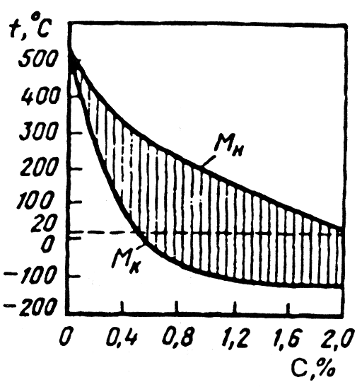 Размеры кристаллов любой морфология мартенсита определяются величиной исходного зерна аустенита. Они тем крупнее, чем больше зерно аустенита. Первая пластина мартенсита имеет протяженность, соответствующую поперечному размеру зерна аустенита. Кристаллы, образующиеся при более низких температурах, имеют уже меньшую протяженность (рис. 8.10, а). Если эвтектоидную сталь охладить только до комнатной температуры, то в структуре кроме мартенсита будет присутствовать некоторое количество остаточного аустенита. Наличие остаточного аустенита нежелательно, так как это приводит к неоднородности свойств по сечению и изменению размеров деталей. Последнее обстоятельство объясняется тем, что мартенсит имеет наибольший удельный объем по сравнению с другими структурами, а аустенит — наименьший. Поэтому при переходе от аустенитной структуры к мартенситной объем и размеры деталей увеличиваются. К особенностям мартенситного превращения относится то, что оно происходит только при непрерывном охлаждении. Задержка охлаждения при температуре выше температуры конца мартенситного превращения приводит к стабилизации аустенита. Аустенит становится более устойчивым. При последующем охлаждении его превращение затруднено и протекает с меньшей интенсивностью и полнотой. Эффект стабилизации аустенита зависит от температуры остановки при охлаждении. Таким образом, особенностями мартенситного превращения являются его бездиффузионный характер, ориентированность кристаллов и образование при непрерывном охлаждении в интервале температур М н– М к. Характерной чертой мартенсита является его высокая твердость и прочность, значения которых возрастают с увеличением содержания углерода в мартенсите. Временное сопротивление низкоуглеродистого мартенсита (0, 025 % С) составляет 1000 МПа, а мартенсит с содержанием 0, 6–0, 7 % С имеет временное сопротивление 2 600–2 700 МПа. Однако с повышением в мартенсите содержания углерода возрастает и его склонность к хрупкому разрушению. Мартенсит, содержащий более 0, 35–0, 4 % С, имеет низкое сопротивление зарождению и распространению трещины, а также низкие значения вязкости разрушения K Iс. Увеличение удельного объема при образовании мартенсита является одной из основных причин возникновения при закалке больших внутренних напряжений, вызывающих деформацию и коробление изделий, а также появление закалочных трещин.