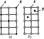 Рис.4.4. Кристаллическая решетка твердых растворов замещения (а), внедрения (б) При образовании растворов замещения периоды решетки изменяются в зависимости от разности атомных диаметров растворенного элемента и растворителя. Если атом растворенного элемента больше атома растворителя, то элементарные ячейки увеличиваются, если меньше – сокращаются. В первом приближении это изменение пропорционально концентрации растворенного компонента. Изменение параметров решетки при образовании твердых растворов – важный момент, определяющий изменение свойств. Уменьшение параметра ведет к большему упрочнению, чем его увеличение. Твердые растворы внедрения образуются внедрением атомов растворенного компонента в поры кристаллической решетки растворителя (рис. 4.4 б). Образование таких растворов, возможно, если атомы растворенного элемента имеют малые размеры. Такими являются элементы, находящиеся в начале периодической системы Менделеева, углерод, водород, азот, бор. Размеры атомов превышают размеры межатомных промежутков в кристаллической решетке металла, это вызывает искажение решетки и в ней возникают напряжения. Концентрация таких растворов не превышает 2-2.5% Твердые растворы вычитания или растворы с дефектной решеткой. образуются на базе химических соединений, при этом возможна не только замена одних атомов в узлах кристаллической решетки другими, но и образование пустых, не занятых атомами, узлов в решетке. К химическому соединению добавляют, один из входящих в формулу элементов, его атомы занимают нормальное положение в решетке соединения, а места атомов другого элемента остаются, незанятыми.