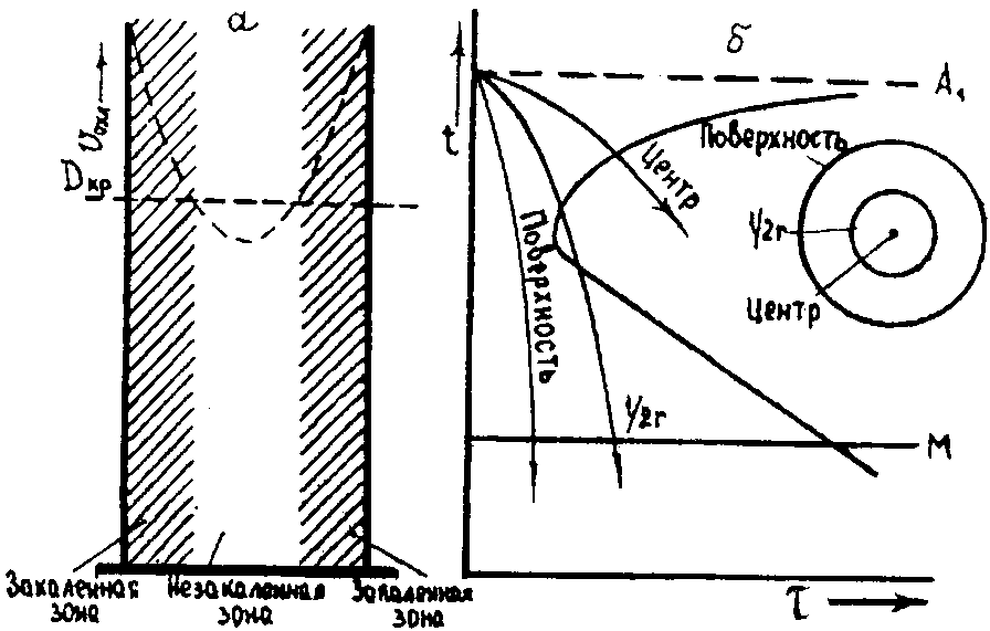 Рис. 9.1. Распределение скорости охлаждения по сечению изделия и глубина закаленного слоя Если критическая скорость охлаждения Vкр´ равна величине Vкр (рис. 9.1а), то деталь не прокаливается по всему сечению (см. заштрихованный слой). В том случае, когда скорость охлаждения в центре изделия больше Vкр, деталь получит сквозную прокаливаемость; если скорость охлаждения на поверхности меньше Vкр, то деталь не закалится даже на поверхности (рис. 9.1б). Следовательно, с уменьшением критической скорости охлаждения будет увеличиваться глубина закаленного слоя. Закаливаемость стали, зависит главным образом, от содержания углерода в стали. Прокаливаемость же определяется факторами, способствующими увеличению устойчивости аустенита при охлаждении, т.е. уменьшающими критическую скорость охлаждения. К этим факторам относятся: - химический состав стали (элементы растворимые в аустените (Si, Ni, Mn), замедляют его превращение, поэтому прокаливаемость легированной конструкционной стали, достигает 400 мм и более, а прокаливаемость углеродистой стали, даже с высоким содержанием углерода не превышает 10-15мм); - размер зерна аустенита (увеличение размера зерна аустенита замедляет его превращение, так как центры кристаллизации возникают преимущественно по границам зерен, а суммарная протяженность границ у крупнозернистой стали меньше, чем у мелкозернистой); - температура нагрева и время выдержки при данной температуре (увеличение прокаливаемости с ростом температуры объясняется ростом зерна аустенита и более полным растворением карбидов и различных включений, присутствие которых уменьшает устойчивость аустенита). В практике, однако, перегрев редко используется, так как при закалке он ухудшает механические свойства стали, вызывает коробление, поводку, трещины. Схематически зависимость прокаливаемости от перечисленных факторов представлена на рис. 9.2.