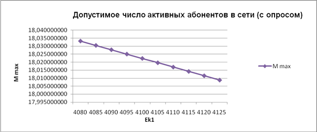 Вывод: Наблюдается обратная линейная зависимость максимального допустимого числа активных абонентов в сетиот изменения длины кадра-запроса на обслуживание. То есть чем больше становится длина кадра-запроса на обслуживание, тем меньше становится максимальное допустимое число абонентов в сети. Без опроса