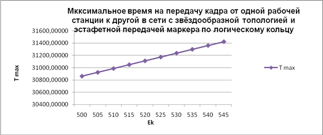 Вывод: Наблюдается прямая линейная зависимость максимального времени на передачу кадра от одной рабочей станции к другой в сети с звездообразной топологией и эстафетной передачей маркера по логическому кольцу от изменения длины кадра вместе с маркером. То есть чем больше становится длина кадра вместе с маркером, тем больше становится максимальное времея на передачу кадра от одной рабочей станции к другой в сети с звездообразной топологией и эстафетной передачей маркера по логическому кольцу. #include " stdafx.h" #include< iostream> using namespace std;