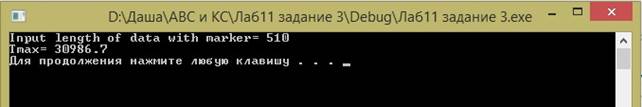 void main() { double Spc, Vc, Ek, Vk, Tz, Npc, Tmax; cout < < " Input length of data with marker= "; cin > > Ek; Spc = 0.5; Vc = 50000; Vk = 9; Tz = 1750; Npc = 15; Tmax = (Spc * 1000000 / Vc + Ek * 8 / Vk + Tz)*(Npc - 1); cout < < " Tmax= " < < Tmax< < endl; system(" pause"); }