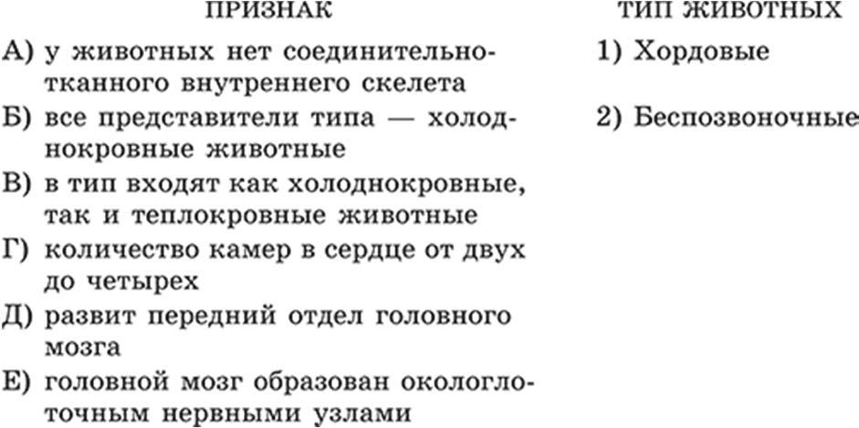 1) головной мозг не дифференцирован на отделы 2) внутренний скелет представлен хордой 3) органы выделения – почки 4) кровеносная система незамкнута 5) органы зрения и слуха хорошо развиты 6) глотка пронизана жаберными щелями ВЗ. Установите соответствие между признаками животных и типом, к которому относятся эти животные