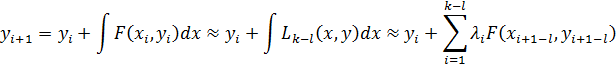 Полученное таким образом семейство формул называется явной k -шаговой схемой Адамса (методы Адамса-Башфорта). Так как для вычислений по k -шаговой формуле необходимо знание значения функции в k узлах. Поэтому приходится (k-1) решение в первых узлах x1, x2, …, xk-1 получать с помощью какого-либо одношагового метода, например метода Рунге-Кутты 4–го порядка.