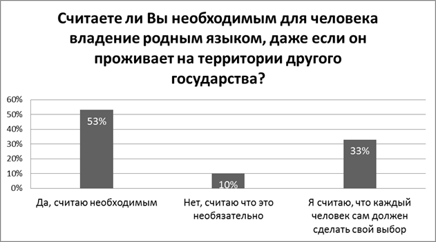 Гистограмма 2. Владение родным языком на территории другого государства 53% респондентов считают необходимым использование родного языка на территории другого государства. 33% опрошенных считают, что человек сам должен сделать выбор владеть или не владеть родным языком, если проживаешь на территории другого государства. Из представленных выше диаграмм и гистограмм, можно сделать вывод, что язык для азербайджанского народа является очень важным фактором (основой) взаимодействия между представителями своей этнической группы; а также знание другого языка (языка страны, в которой проживают на данный момент). Стоит отметить, что знание языка страны проживания способствует отличным межличностным отношениям представителей азербайджанского этноса с разными национальностями на территории Нижегородского региона, которые происходят в разных сферах общения - трудового, семейно-бытового, а также соседского, дружеского и других видах неформального общения.