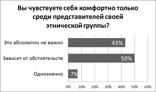 Гистограмма 4. Этническая принадлежность друзей 43 % опрошенных (гистограмма 3) считают, что «абсолютно не важно» среди представителей какого этноса ты находишься, они чувствуют себя комфортно с представителями различных этнических групп. Но также почти половина респондентов считают, что могут чувствовать себя комфортно с представителями других этносов только при определенных обстоятельствах, а значит им все же комфортнее с представителями своего (азербайджанского) этноса. 70% респондентов (гистограмма 4) общаются с другими представителями этнических групп, это свидетельствует о широком и дружеском взаимодействии азербайджанского этноса с другими этносами на территории Нижегородского региона. Таким образом, можно сказать, что на территории г. Нижнего Новгорода положительно развиты межэтнические отношения. А значит различные факторы (воспитание в семье, этническая и социальная среда, политическая система, этническая политика государства и др.) способствуют развитию доброжелательных межэтнических взаимоотношений.