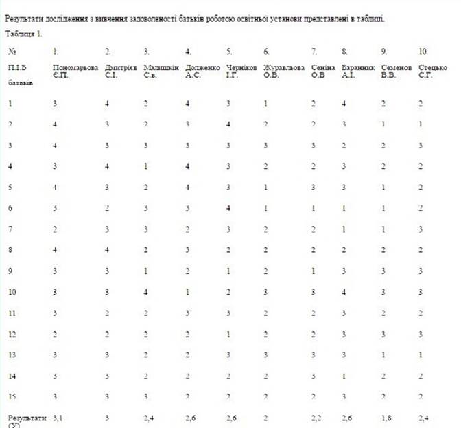 За результатами дослідження можна сказати про низький рівень задоволеності батьків діяльністю освітнього закладу, оскільки коефіцієнт У знаходиться в межах від-2-3. Багато батьків задоволені колективом, в якому вчиться їх дитина. Це дуже важливо, оскільки дитина дуже тісно пов'язаний з сім'єю, він ще не придбав потрібної здібності до управління своїми почуттями, своєю поведінкою і поки ще намагається, звичайно, неусвідомлено, шукати в школі те, в чому він потребує.