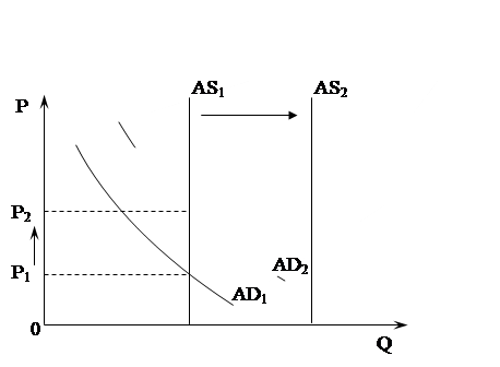 II. Сукупна пропозиція (AS) – це обсяг товарів та послуг, який фірми готові виробляти та продавати протягом року за кожного рівня цін. Закон пропозиції справедлив і для рівня національної економіки: рівень цін і величина сукупної пропозиції прямопропорційно залежать один від одного. Форма кривої сукупної пропозиції інтерпретується по-різному в класичній і кейнсіанських моделях. Класична модель описує поведінку економіки у довгостроковому періоді. Аналіз сукупної пропозиції базується на наступних умовах: 1) обсяги виробництва залежать від обсягів ресурсів та рівня технологій і не залежать від рівня цін; 2) зміни обсягів ресурсів та технологій відбуваються повільно; 3) економіка функціонує в умовах повної зайнятості факторів виробництва, отже, обсяг випуску дорівнює потенційному; 4) ціни та заробітна плата гнучкі, їх зміни підтримають рівновагу на ринках.