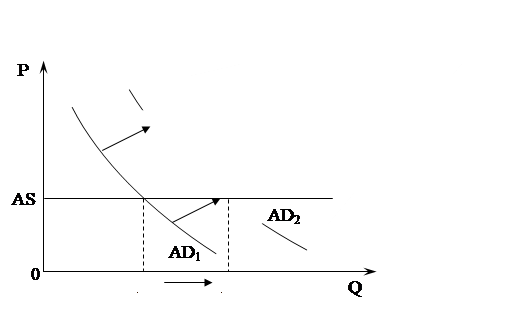 Кейнсіанська модель розглядає функціонування економіки у короткостроковому періоді. Аналіз сукупної пропозиції базується на наступних умовах: 1) економіка функціонує в умовах неповної зайнятості ресурсів, підприємці можуть додатково залучати трудові ресурси без збільшення рівня оплати праці та цін на продукцію; 2) ціни та номінальна заробітна плата досить жорсткі та повільно реагують на ринкові коливання. Причинами відносної жорсткості цін та заробітної плати є: трудові контракти, законодавчо встановлений мінімальний рівень заробітної плати, строки контрактів на поставку сировини та продукції, діяльність профсоюзів; 3) реальні величини (обсяг зайнятості, обсяг випуску) – рухомі та реагують на ринкові коливання. Крива AS у кейнсіанській теорії горизонтальна. За цих передумов зміни у сукупному попиті відбиваються на обсягах випуску і майже не впливають на рівень цін. Невипадково в кейнсіанській теорії пропонується активне державне регулювання рівня сукупного попиту.