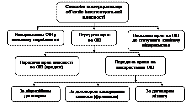 Метою комерціалізації є отримання прибутку за рахунок використання об'єктів права інтелектуальної власності у власному виробництві або продажу чи передачі прав на їх використання іншим юридичним чи фізичним особам. Комерціалізація об'єктів інтелектуальної власності – це взаємовигідні (комерційні) дії всіх учасників процесу перетворення результатів інтелектуальної праці у ринковий товар. Схематично способи комерціалізації прав на ОІВ представлені на рис. 5.