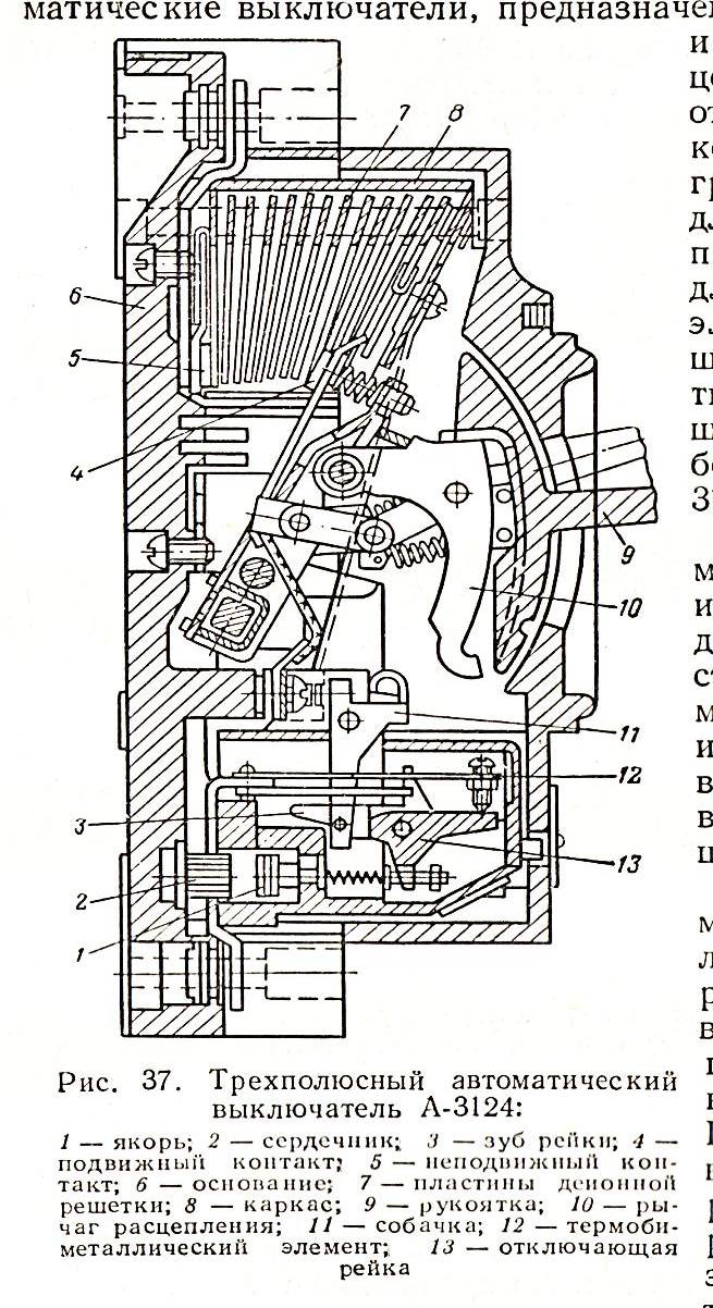 1 – якорь; 2 – сердечник; 3 – зуб рейки; 4 – под-вижный контакт; 5 – неподвижный контакт; 6 – основание; 7 – пласти-ны деионной решетки; 8 – каркас; 9 – рукоятка; 10 – рычаг расцепления; 11 – собачка; 12 – тер-мобиеталлический эле-мент; 13 – отключающая рейка